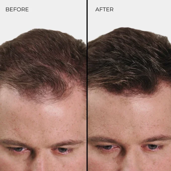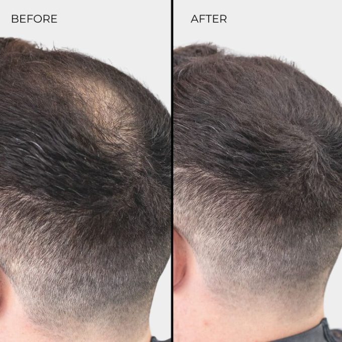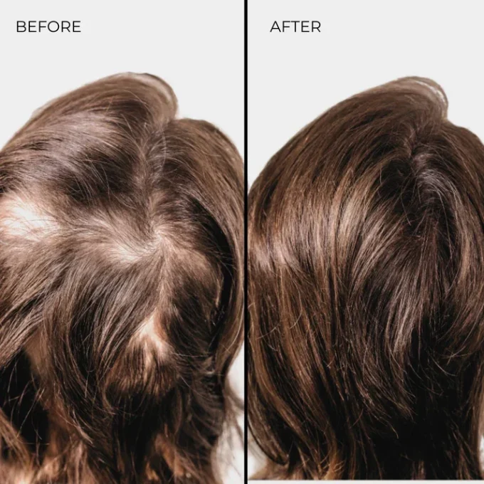Stap 2 – Bestrooi lichtjes de haarvezels op plaatsen waar dikker haar en volume nodig is. Masseer, indien nodig, lichtjes met je vingertoppen op je haar om de vezels te verdelen.